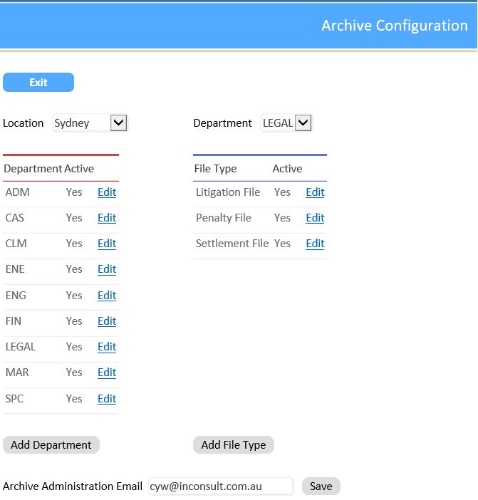 Enter an email address in the Achive Administration Email field. This is the default email address to send the automated archive retrieval request email for the selected location. Each location can have a different email address.