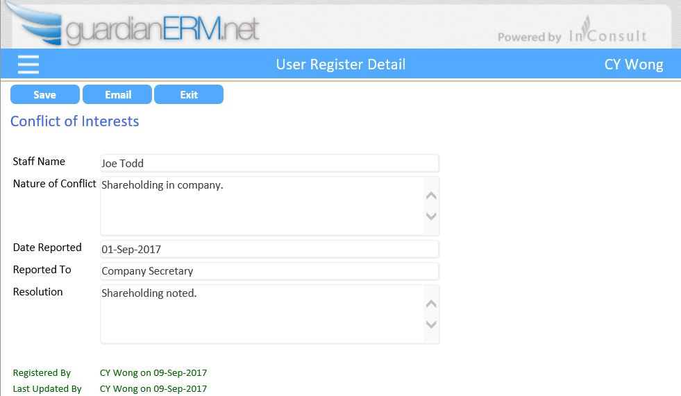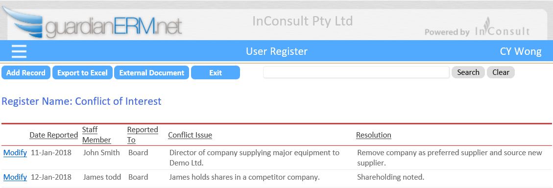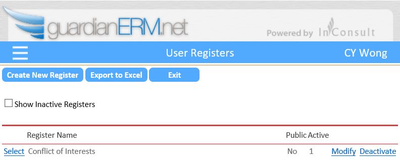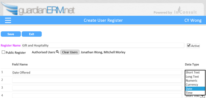 In GuardianERM, users can create registers to record items and activities to support their risk management and compliance obligations.  Some popular registers include Gift and Hospitality, Conflict of Interests, Contractors and Assets.